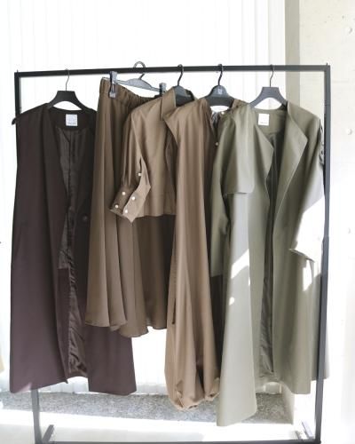 カーキのノーカラーコートは